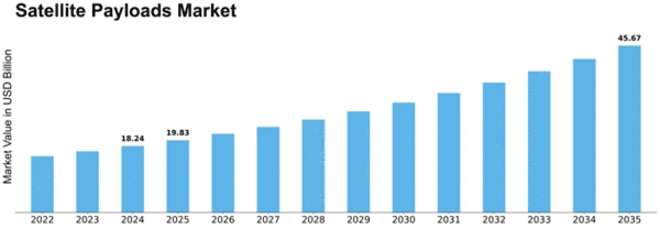 As per MRFR analysis, the Satellite Payloads Market Size was estimated at 18.24 USD Billion in 2024. The Satellite Payloads Market industry is projected to grow from 19.83 USD Billion in 2025 to 45.67 USD Billion by 2035, exhibiting a compound annual growth rate (CAGR) of 8.7 during the forecast period 2025–2035.